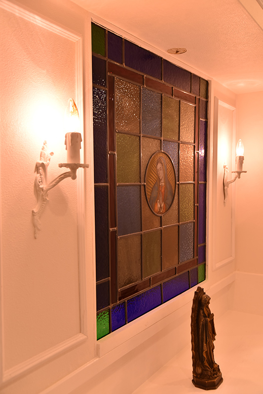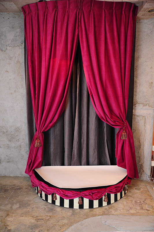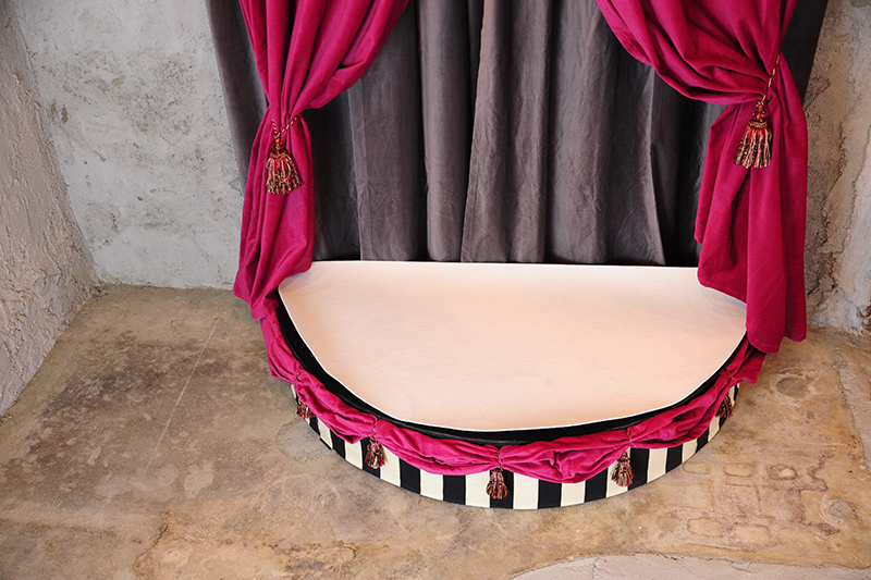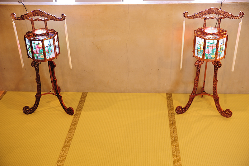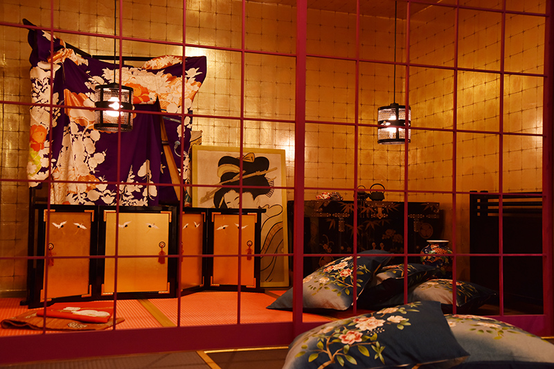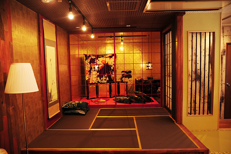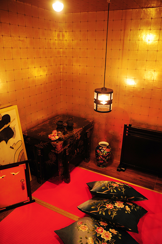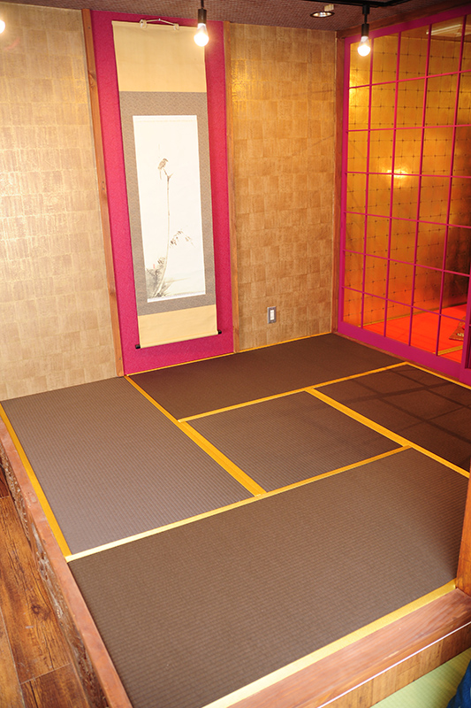 2階 黒たたみ、掛け軸、赤畳、金壁